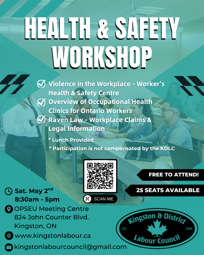 On May 2, 2026, the Kingston & District Labour Council invites workers and union members to a one-day workshop on violence in the workplace and worker health and safety.